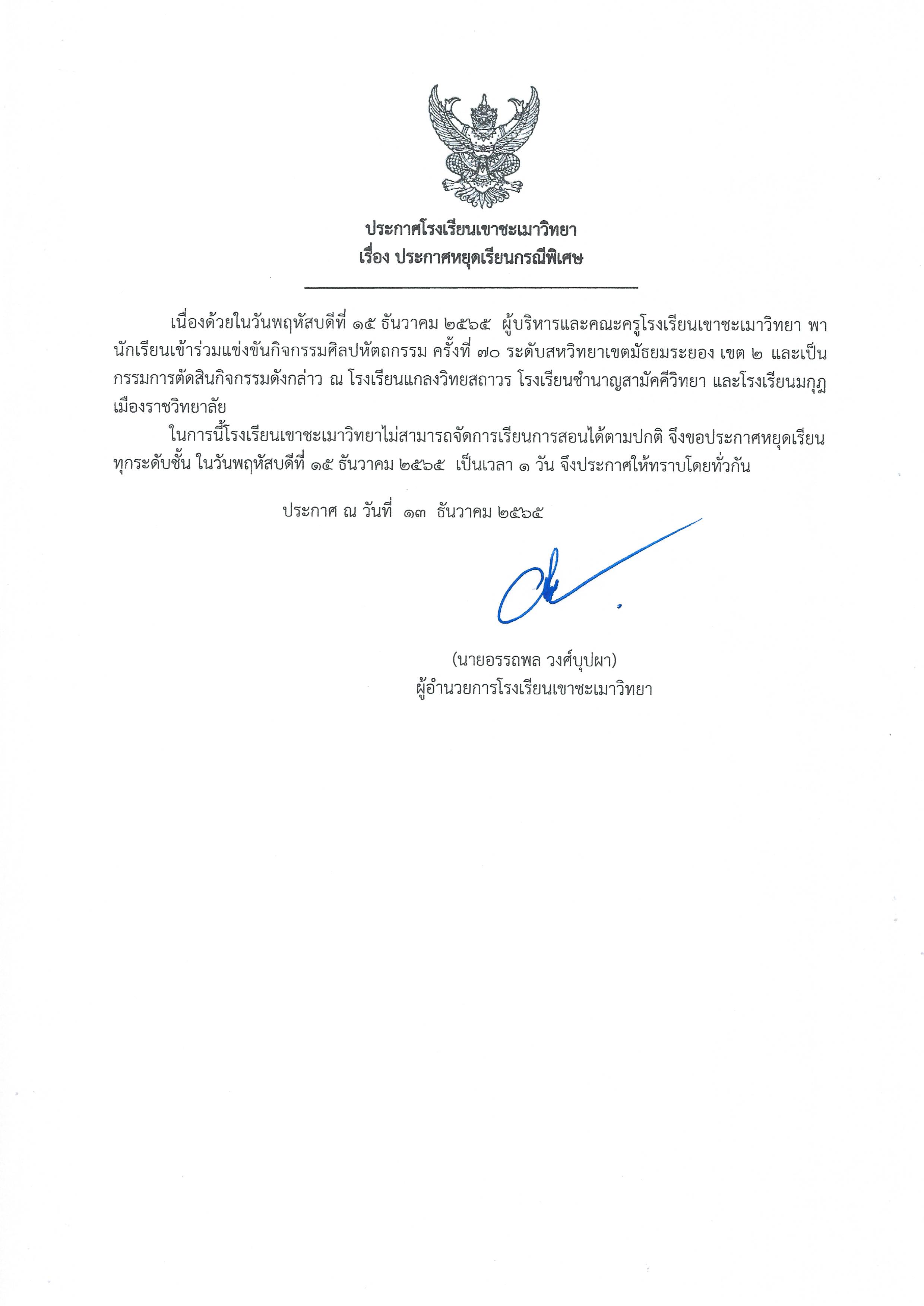 ประกาศหยุดเรียนกรณีพิเศษ ในวันพฤหัสบดีที่ 15 ธันวาคม 2565