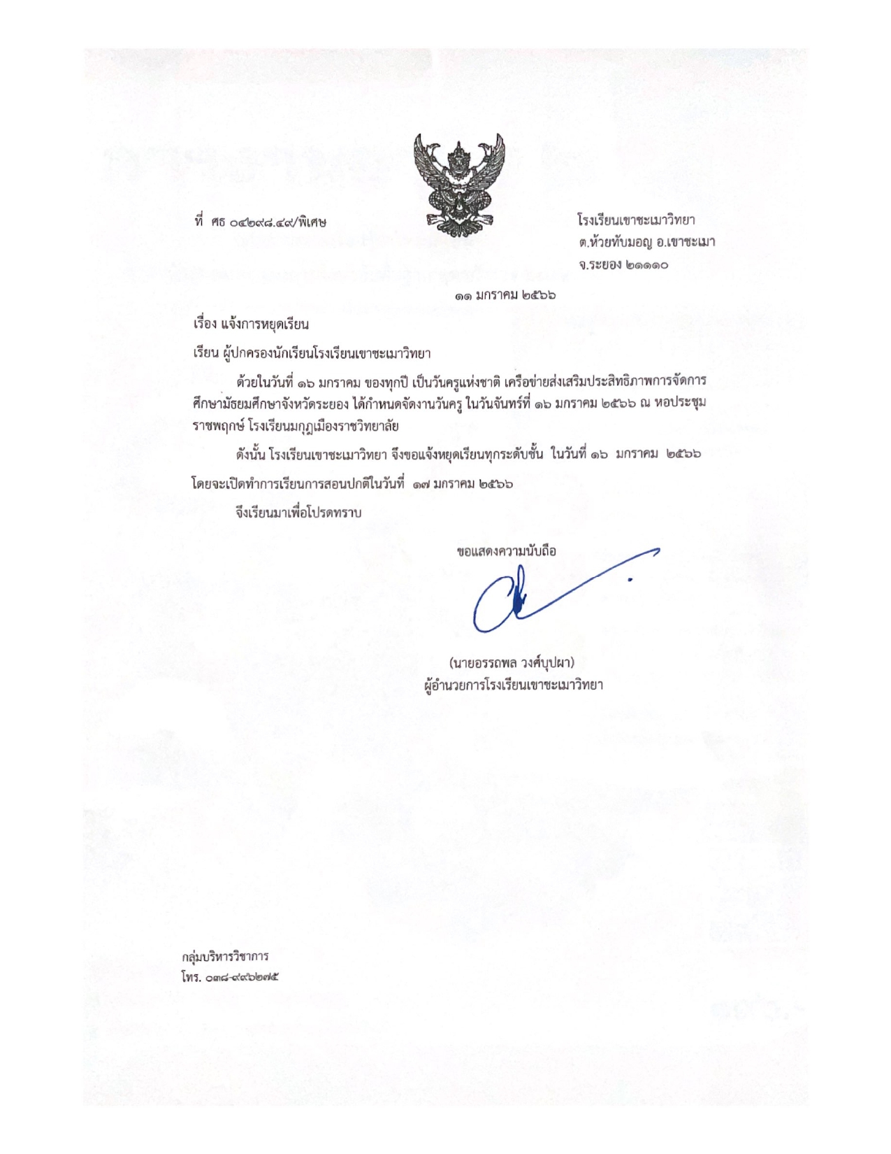 ประกาศหยุดเรียนเนื่องในวันครู