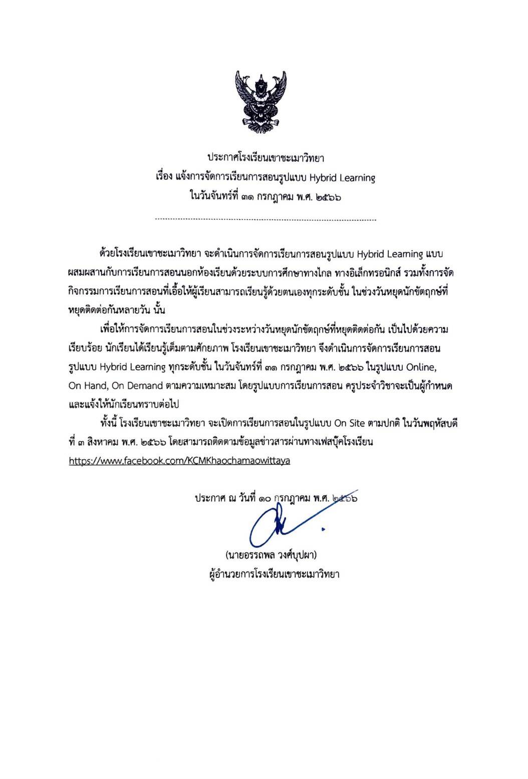 ประกาศการจัดการเรียนการสอน วันที่ 31 กรกฎาคม 2566 รูปแบบผสมผสาน