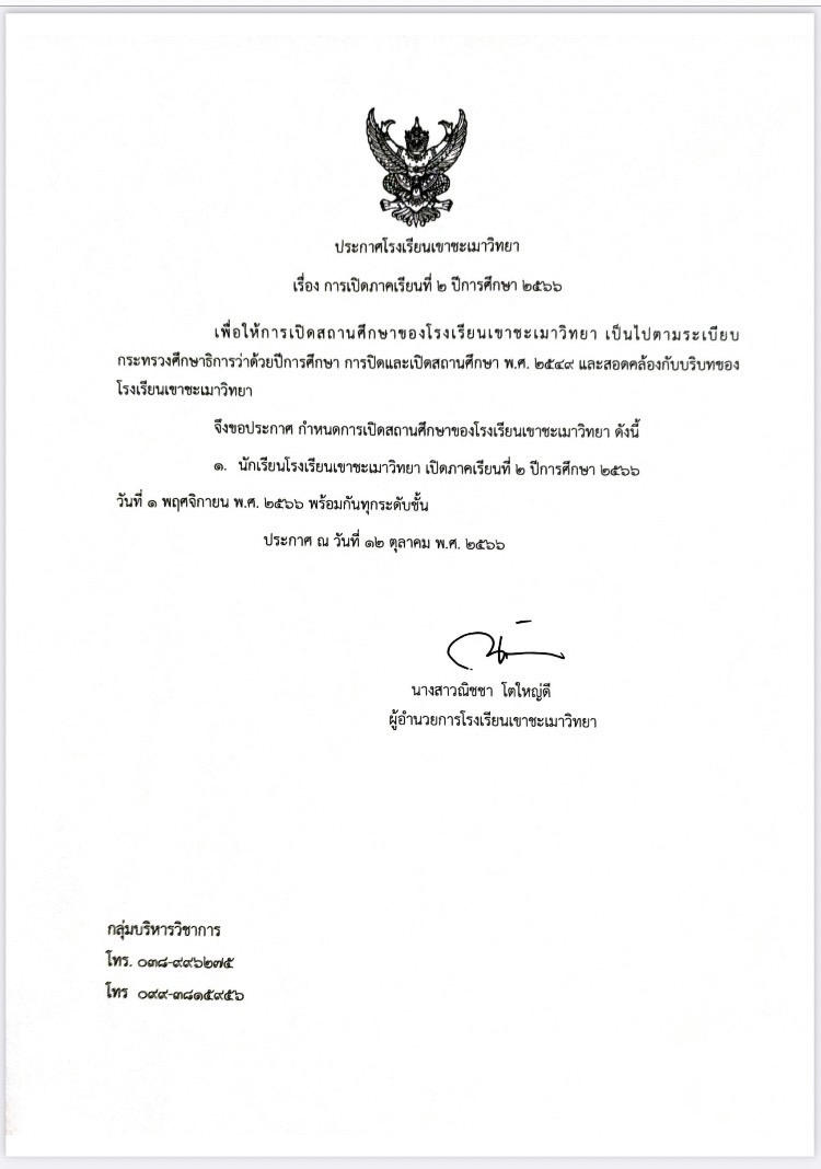 ประกาศการเปิดภาคเรียนที่ 2 ปีการศึกษา 2566