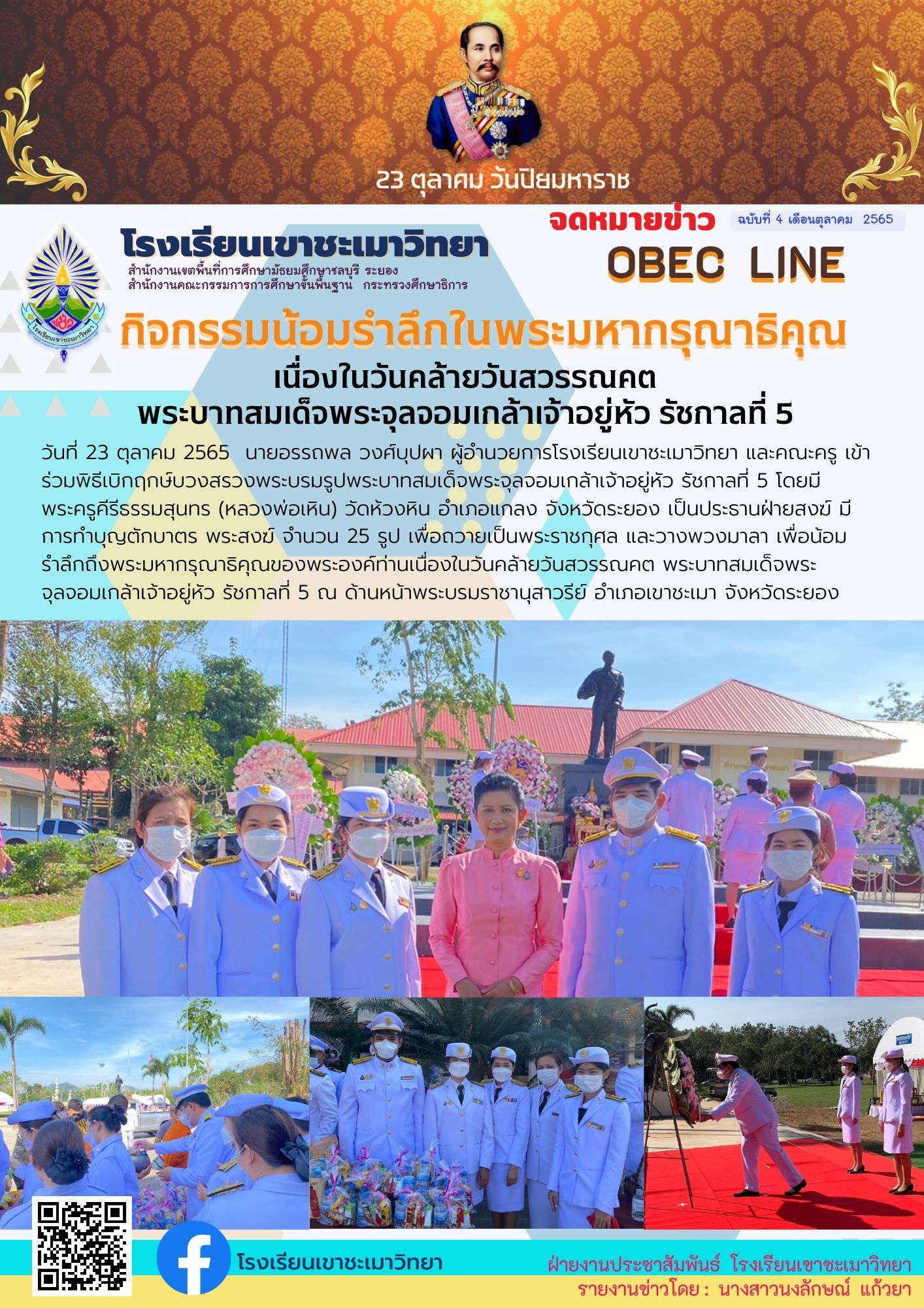 วันที่ 23 ตุลาคม 2565 นายอรรถพล วงศ์บุปผา ผู้อำนวยการโรงเรียนเขาชะเมาวิทยา และคณะครู เข้าร่วมพิธีเบิกฤกษ์บวงสรวงพระบรมรูปพระบาทสมเด็จพระจุลจอมเกล้าเจ้าอยู่หัว รัชกาลที่ 5 โดยมี พระครูคีรีธรรมสุนทร (หลวงพ่อเหิน) วัดห้วงหิน อำเภอแกลง จังหวัดระยอง เป็นประธานฝ่ายสงฆ์ มีการทำบุญตักบาตร พระสงฆ์ จำนวน 25 รูป เพื่อถวายเป็นพระราชกุศล และวางพวงมาลา เพื่อน้อมรำลึกถึงพระมหากรุณาธิคุณของพระองค์ท่านเนื่องในวันคล้ายวันสวรรณคต พระบาทสมเด็จพระจุลจอมเกล้าเจ้าอยู่หัว รัชกาลที่ 5 ณ ด้านหน้าพระบรมราชานุสาวรีย์ อำเภอเขาชะเมา จังหวัดระยอง