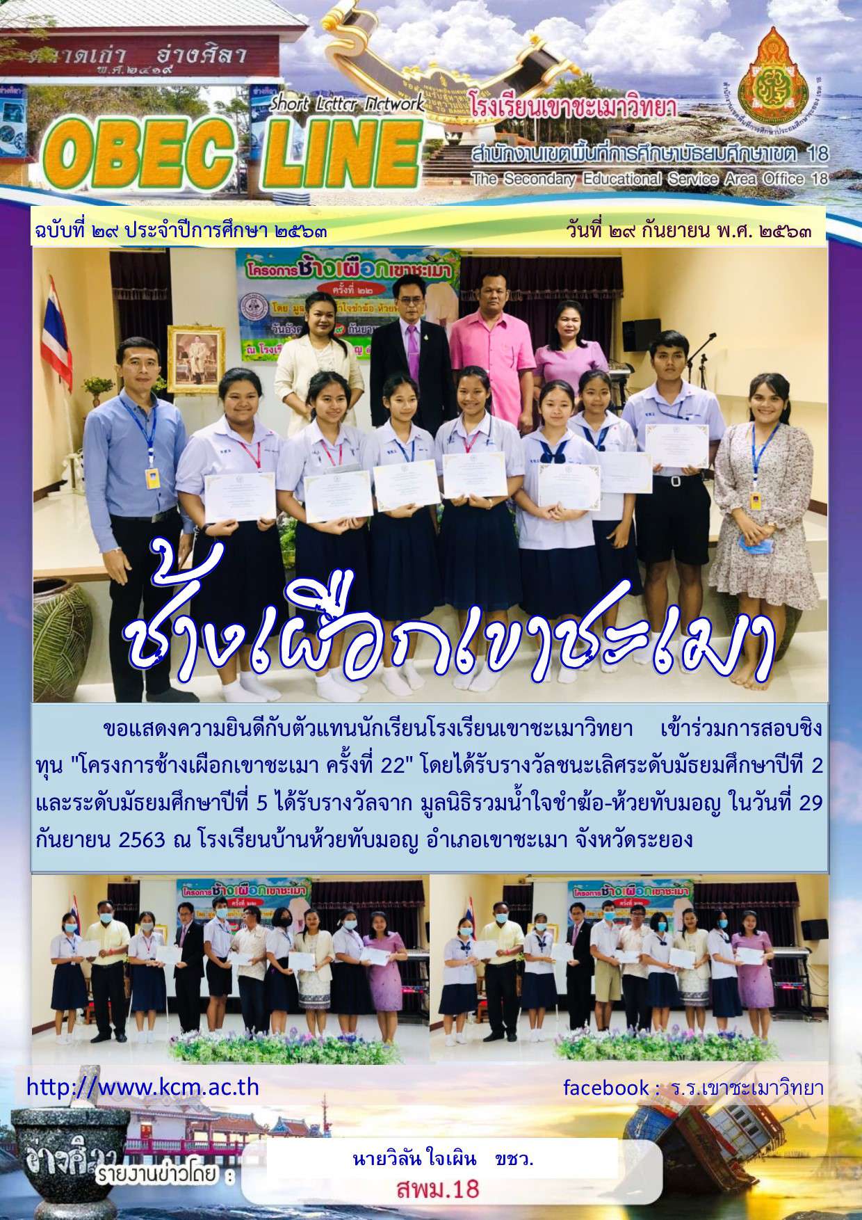 ขอแสดงความยินดีกับตัวแทนนักเรียนโรงเรียนเขาชะเมาวิทยา เข้าร่วมการสอบชิงทุน "โครงการช้างเผือกเขาชะเมา ครั้งที่ 22" โดยได้รับรางวัลชนะเลิศระดับมัธยมศึกษาปีที 2 และระดับมัธยมศึกษาปีที่ 5 ได้รับรางวัลจาก มูลนิธิรวมน้ำใจชำฆ้อ-ห้วยทับมอญ ในวันที่ 29 กันยายน 2563 ณ โรงเรียนบ้านห้วยทับมอญ อำเภอเขาชะเมา จังหวัดระยอง
