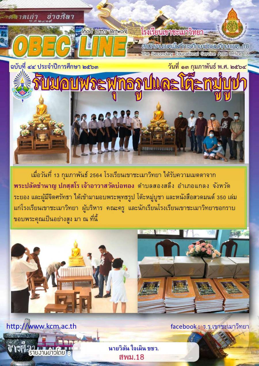 เมื่อวันที่ 13 กุมภาพันธ์ 2564 โรงเรียนเขาชะเมาวิทยา ได้รับความเมตตาจาก          พระปลัดชำนาญ ปภสฺสโร เจ้าอาวาสวัดบ่อทอง  ตำบลสองสลึง  อำเภอแกลง  จังหวัดระยอง และผู้มีจิตศรัทธา ได้เข้ามามอบพระพุทธรูป โต๊ะหมู่บูชา และหนังสือสวดมนต์ 350 เล่ม แก่โรงเรียนเขาชะเมาวิทยา  ผู้บริหาร  คณะครู  และนักเรียนโรงเรียนเขาชะเมาวิทยาขอกราบขอบพระคุณเป็นอย่างสูง มา ณ ที่นี้