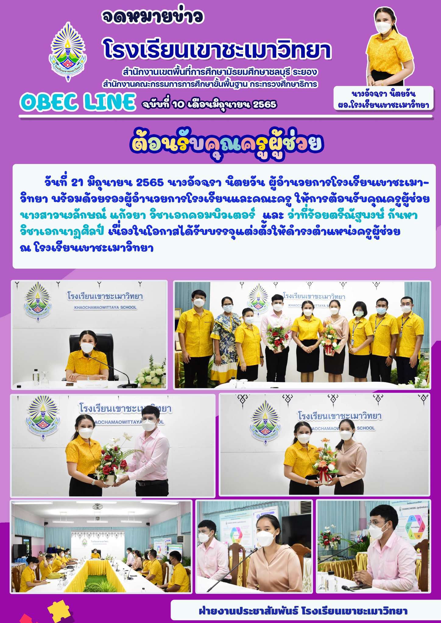 วันที่ 21 มิถุนายน 2565 นางอัจฉรา นิตยวัน ผู้อำนวยการโรงเรียนเขาชะเมาวิทยา พร้อมด้วยรองผู้อำนวยการโรงเรียนและคณะครู ให้การต้อนรับคุณครูผู้ช่วย นางสาวนงลักษณ์ แก้วยา วิชาเอกคอมพิวเตอร์ และ ว่าที่ร้อยตรีณัฐพงษ์ กันหา วิชาเอกนาฏศิลป์ เนื่องในโอกาสได้รับบรรจุแต่งตั้งให้ดำรงตำแหน่งครูผู้ช่วย ณ โรงเรียนเขาชะเมาวิทยา