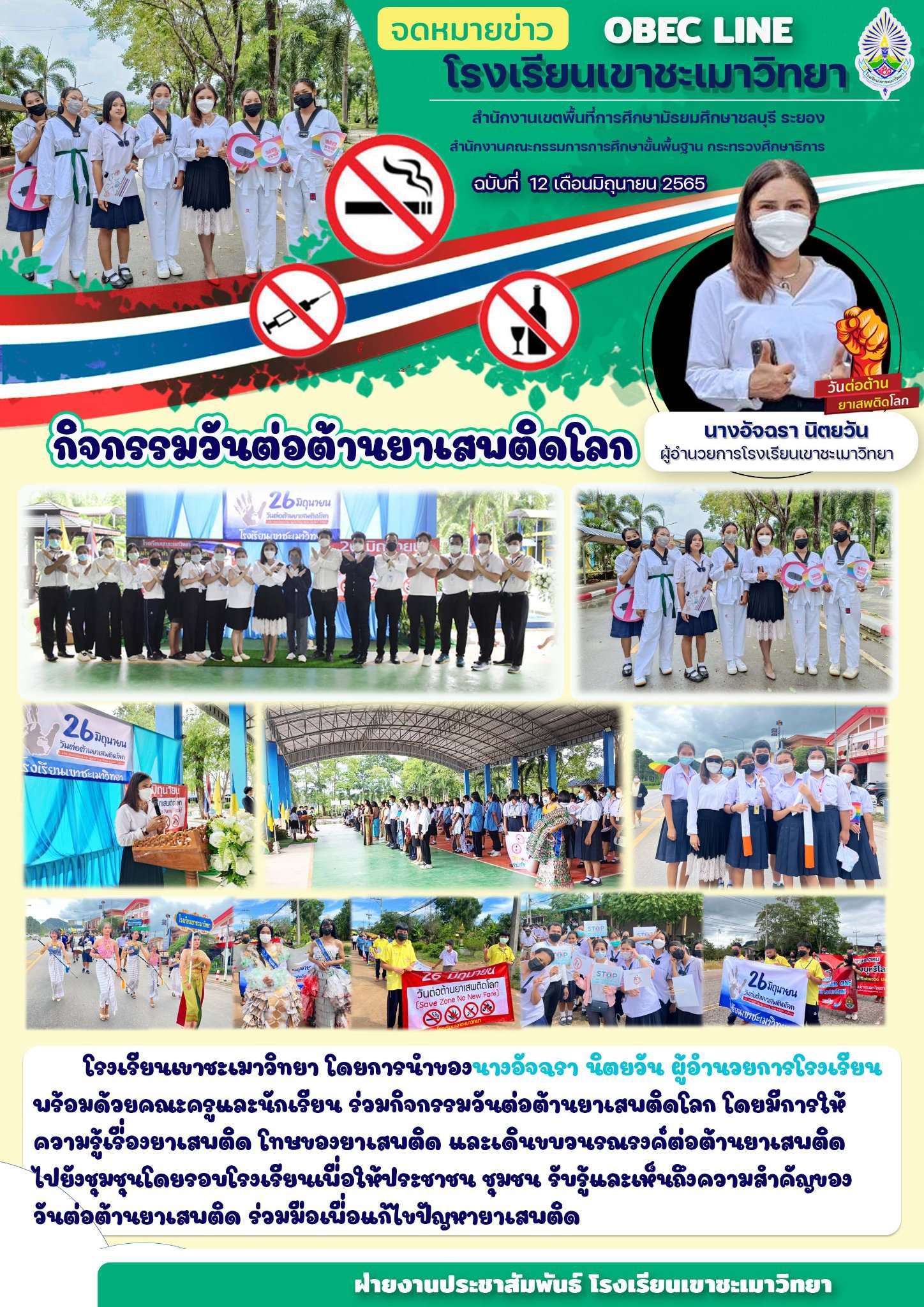 โรงเรียนเขาชะเมาวิทยา โดยการนำของนางอัจฉรานิตยวัน  ผู้อำนวยการโรงเรียนเขาชะเมาวิทยา พร้อมด้วยคณะครูและนักเรียน ร่วมกิจกรรมวันต่อต้านยาเสพติดโลก โดยมีการให้ความรู้เรื่องยาเสพติด โทษของยาเสพติด และเดินขบวนรณรงค์ต่อต้านยาเสพติดไปยังชุมชนโดยรอบโรงเรียนเพื่อให้ประชาชน ชุมชน รับรู้และเห็นถึงความสำคัญของวันต่อต้านยาเสพติด ร่วมมือเพื่อแก้ไขปัญหายาเสพติด