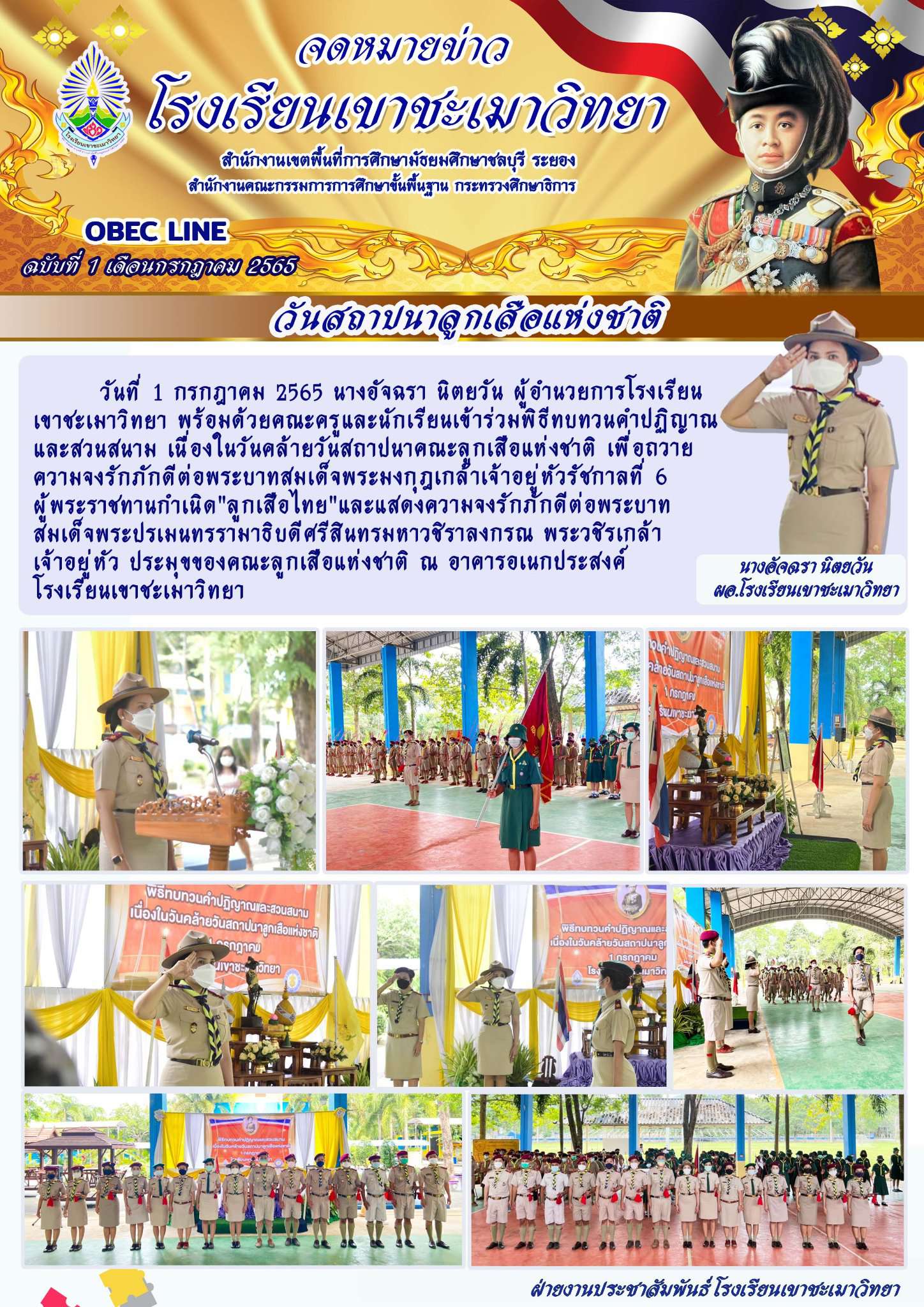 วันที่ 1 กรกฎาคม 2565 นางอัจฉรา นิตยวัน ผู้อำนวยการโรงเรียนเขาชะเมาวิทยา พร้อมด้วยคณะครูและนักเรียนเข้าร่วมพิธีทบทวนคำปฏิญาณและสวนสนาม เนื่องในวันคล้ายวันสถาปนาคณะลูกเสือแห่งชาติ เพื่อถวายความจงรักภักดีต่อพระบาทสมเด็จพระมงกุฎเกล้าเจ้าอยู่หัวรัชกาลที่ 6 ผู้พระราชทานกำเนิด"ลูกเสือไทย"และแสดงความจงรักภักดีต่อพระบาทสมเด็จพระปรเมนทรรามาธิบดีศรีสินทรมหาวชิราลงกรณ พระวชิรเกล้าเจ้าอยู่หัว ประมุขของคณะลูกเสือแห่งชาติ ณ อาคารอเนกประสงค์ โรงเรียนเขาชะเมาวิทยา