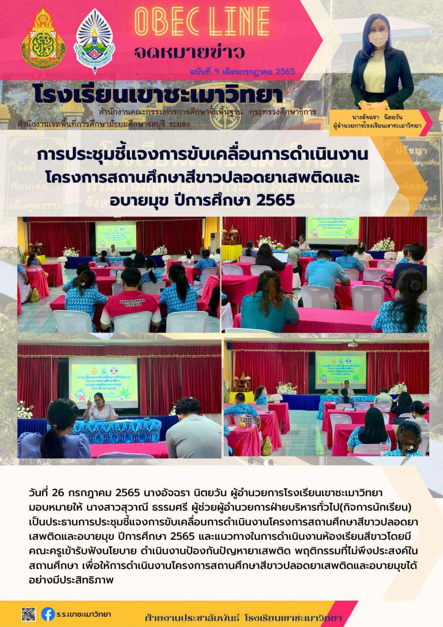 มอบหมายให้ นางสาวสุวาณี ธรรมศรี ผู้ช่วยผู้อำนวยการฝ่ายบริหารทั่วไป(กิจการนักเรียน) เป็นประธานการประชุมชี้แจงการขับเคลื่อนการดำเนินงานโครงการสถานศึกษาสีขาวปลอดยาเสพติดและอบายมุข ปีการศึกษา 2565 และแนวทางในการดำเนินงานห้องเรียนสีขาวโดยมีคณะครูเข้ารับฟังนโยบาย ดำเนินงานป้องกันปัญหายาเสพติด พฤติกรรมที่ไม่พึงประสงค์ในสถานศึกษา เพื่อให้การดำเนินงานโครงการสถานศึกษาสีขาวปลอดยาเสพติดและอบายมุขได้อย่างมีประสิทธิภาพ