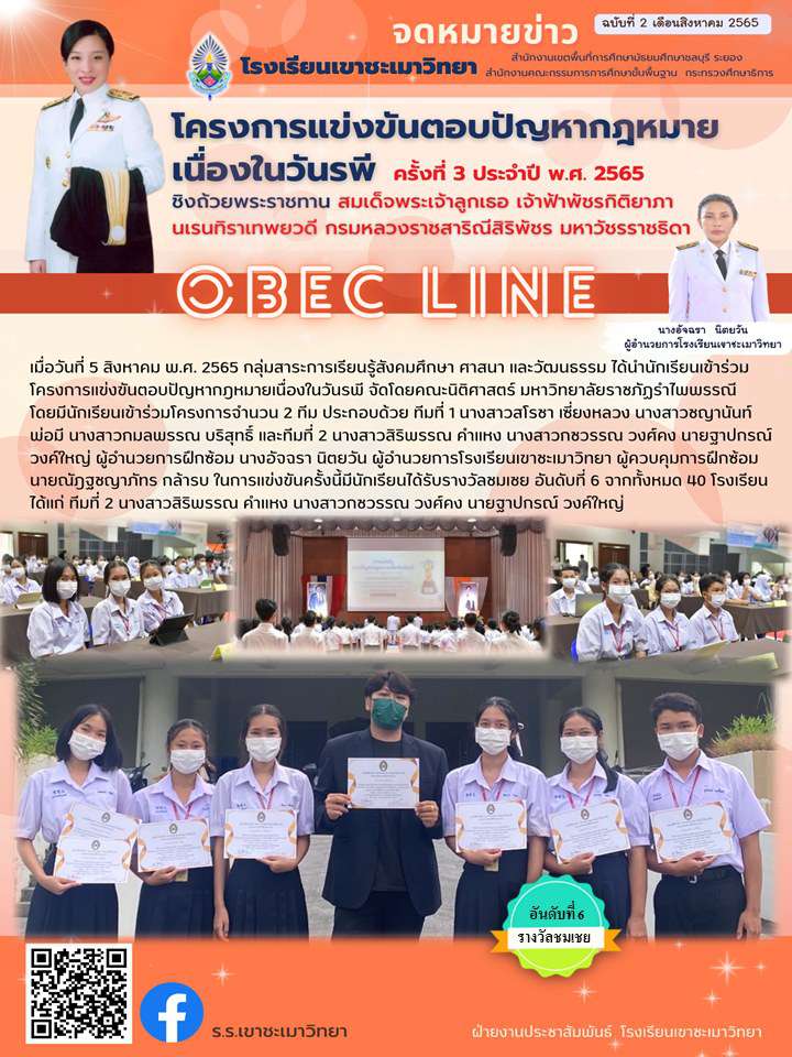 เมื่อวันที่ 5 สิงหาคม พ.ศ. 2565 กลุ่มสาระการเรียนรู้สังคมศึกษา ศาสนา และวัฒนธรรม ได้นำนักเรียนเข้าร่วมโครงการแข่งขันตอบปัญหากฎหมายเนื่องในวันรพี จัดโดยคณะนิติศาสตร์ มหาวิทยาลัยราชภัฏรำไพพรรณี โดยมีนักเรียนเข้าร่วมโครงการจำนวน 2 ทีม ประกอบด้วย ทีมที่ 1 นางสาวสโรชา เซี่ยงหลวง นางสาวชญานันท์ พ่อมี นางสาวกมลพรรณ บริสุทธิ์ และทีมที่ 2 นางสาวสิริพรรณ คำแหง นางสาวกชวรรณ วงศ์คง นายฐาปกรณ์ วงค์ใหญ่ ผู้อำนวยการฝึกซ้อม นางอัจฉรา นิตยวัน ผู้อำนวยการโรงเรียนเขาชะเมาวิทยา ผู้ควบคุมการฝึกซ้อม นายณัฎฐชญาภัทร กล้ารบ ในการแข่งขันครั้งนี้มีนักเรียนได้รับรางวัลชมเชย อันดับที่ 6 จากทั้งหมด 40 โรงเรียน ได้แก่ ทีมที่ 2 นางสาวสิริพรรณ คำแหง นางสาวกชวรรณ วงศ์คง นายฐาปกรณ์ วงค์ใหญ่