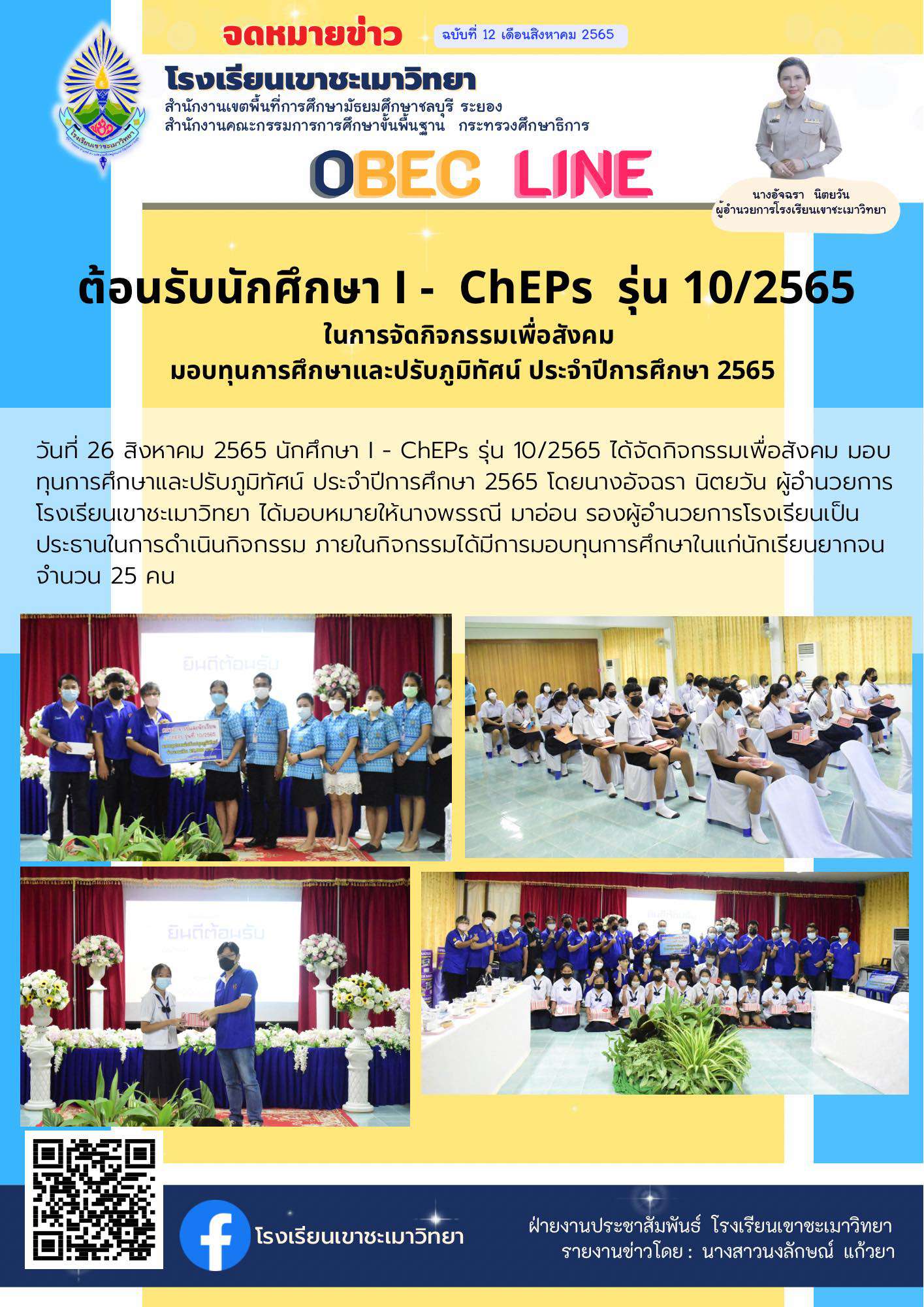 วันที่ 26 สิงหาคม 2565 นักศึกษา I - ChEPs รุ่น 10/2565 ได้จัดกิจกรรมเพื่อสังคม มอบทุนการศึกษาและปรับภูมิทัศน์ ประจำปีการศึกษา 2565 โดยนางอัจฉรา นิตยวัน ผู้อำนวยการโรงเรียนเขาชะเมาวิทยา ได้มอบหมายให้นางพรรณี มาอ่อน รองผู้อำนวยการโรงเรียนเป็นประธานในการดำเนินกิจกรรม ภายในกิจกรรมได้มีการมอบทุนการศึกษาในแก่นักเรียนยากจนจำนวน 25 คน