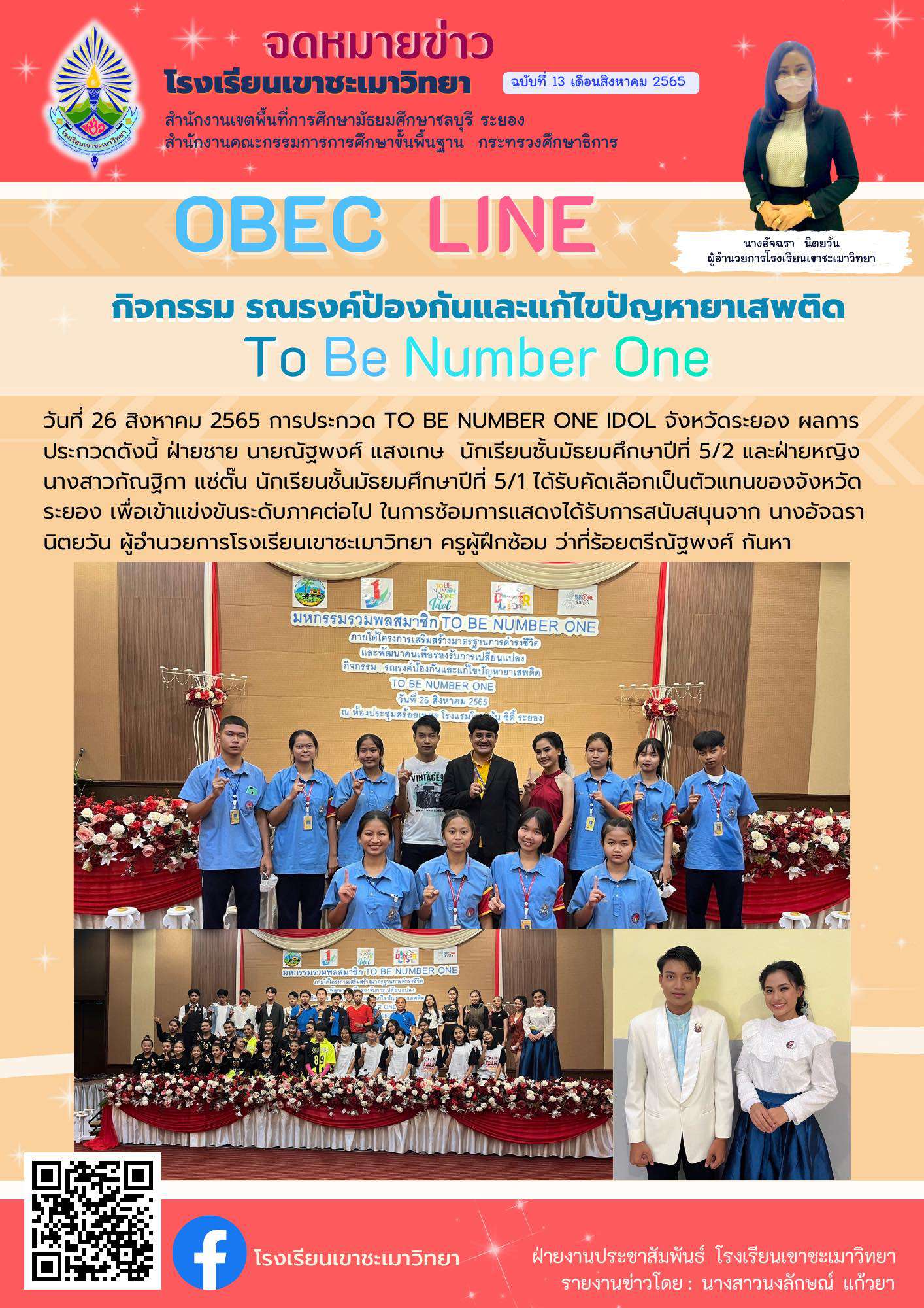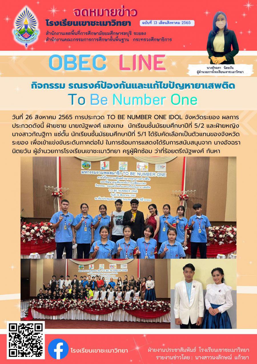 วันที่ 26 สิงหาคม 2565 การประกวด TO BE NUMBER ONE IDOL จังหวัดระยอง ผลการประกวดดังนี้ ฝ่ายชาย นายณัฐพงศ์ แสงเกษ นักเรียนชั้นมัธยมศึกษาปีที่ 5/2 และฝ่ายหญิง นางสาวกัณฐิกา แซ่ตั๊น นักเรียนชั้นมัธยมศึกษาปีที่ 5/1 ได้รับคัดเลือกเป็นตัวแทนของจังหวัดระยอง เพื่อเข้าแข่งขันระดับภาคต่อไป ในการซ้อมการแสดงได้รับการสนับสนุนจาก นางอัจฉรา นิตยวัน ผู้อำนวยการโรงเรียนเขาชะเมาวิทยา ครูผู้ฝึกซ้อม ว่าที่ร้อยตรีณัฐพงศ์ กันหา