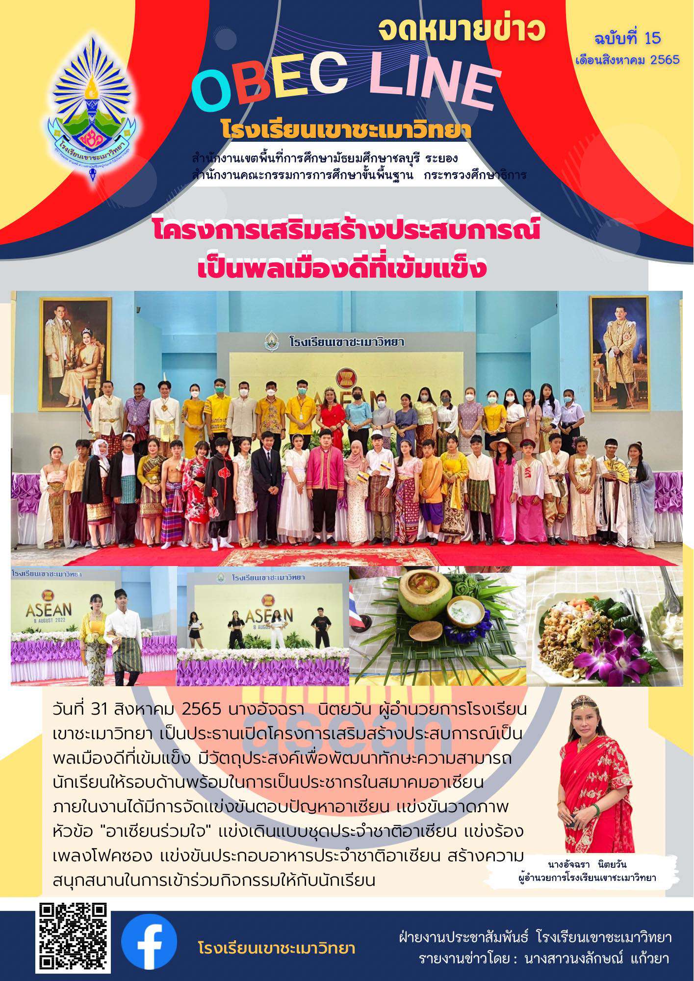 วันที่ 31 สิงหาคม 2565 นางอัจฉรา นิตยวัน ผู้อำนวยการโรงเรียนเขาชะเมาวิทยา เป็นประธานเปิดโครงการเสริมสร้างประสบการณ์เป็นพลเมืองดีที่เข้มแข็ง มีวัตถุประสงค์เพื่อพัฒนาทักษะความสามารถนักเรียนให้รอบด้านพร้อมในการเป็นประชากรในสมาคมอาเซียน ภายในงานได้มีการจัดเเข่งขันตอบปัญหาอาเซียน เเข่งขันวาดภาพ หัวข้อ "อาเซียนร่วมใจ" เเข่งเดินเเบบชุดประจำชาติอาเซียน เเข่งร้องเพลงโฟคซอง เเข่งขันประกอบอาหารประจำชาติอาเซียน สร้างความสนุกสนานในการเข้าร่วมกิจกรรมให้กับนักเรียน