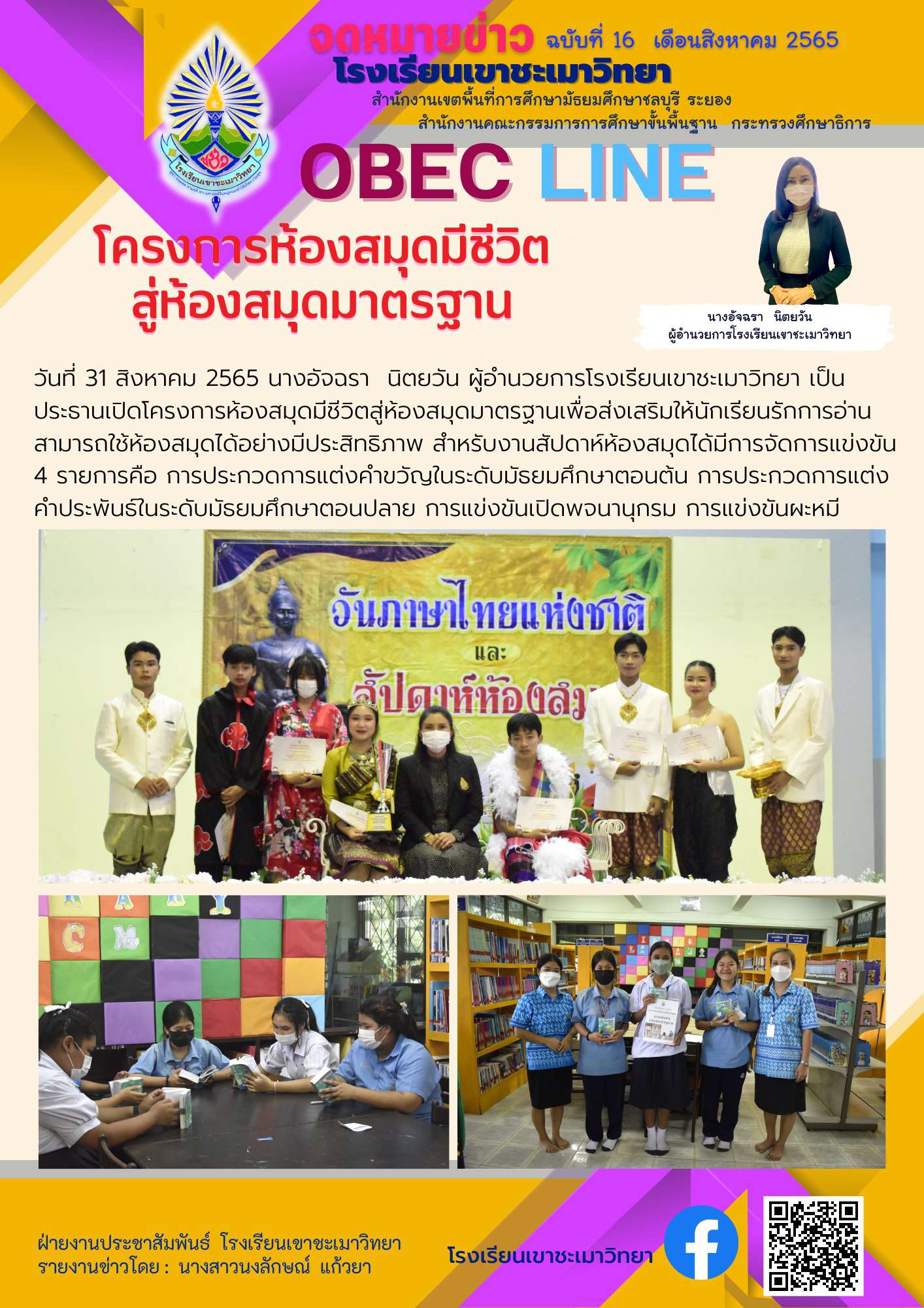วันที่ 31 สิงหาคม 2565 นางอัจฉรา นิตยวัน ผู้อำนวยการโรงเรียนเขาชะเมาวิทยา เป็นประธานเปิดโครงการห้องสมุดมีชีวิตสู่ห้องสมุดมาตรฐานเพื่อส่งเสริมให้นักเรียนรักการอ่าน สามารถใช้ห้องสมุดได้อย่างมีประสิทธิภาพ สำหรับงานสัปดาห์ห้องสมุดได้มีการจัดการแข่งขัน 4 รายการคือ การประกวดการแต่งคำขวัญในระดับมัธยมศึกษาตอนต้น การประกวดการแต่งคำประพันธ์ในระดับมัธยมศึกษาตอนปลาย การแข่งขันเปิดพจนานุกรม การแข่งขันผะหมี