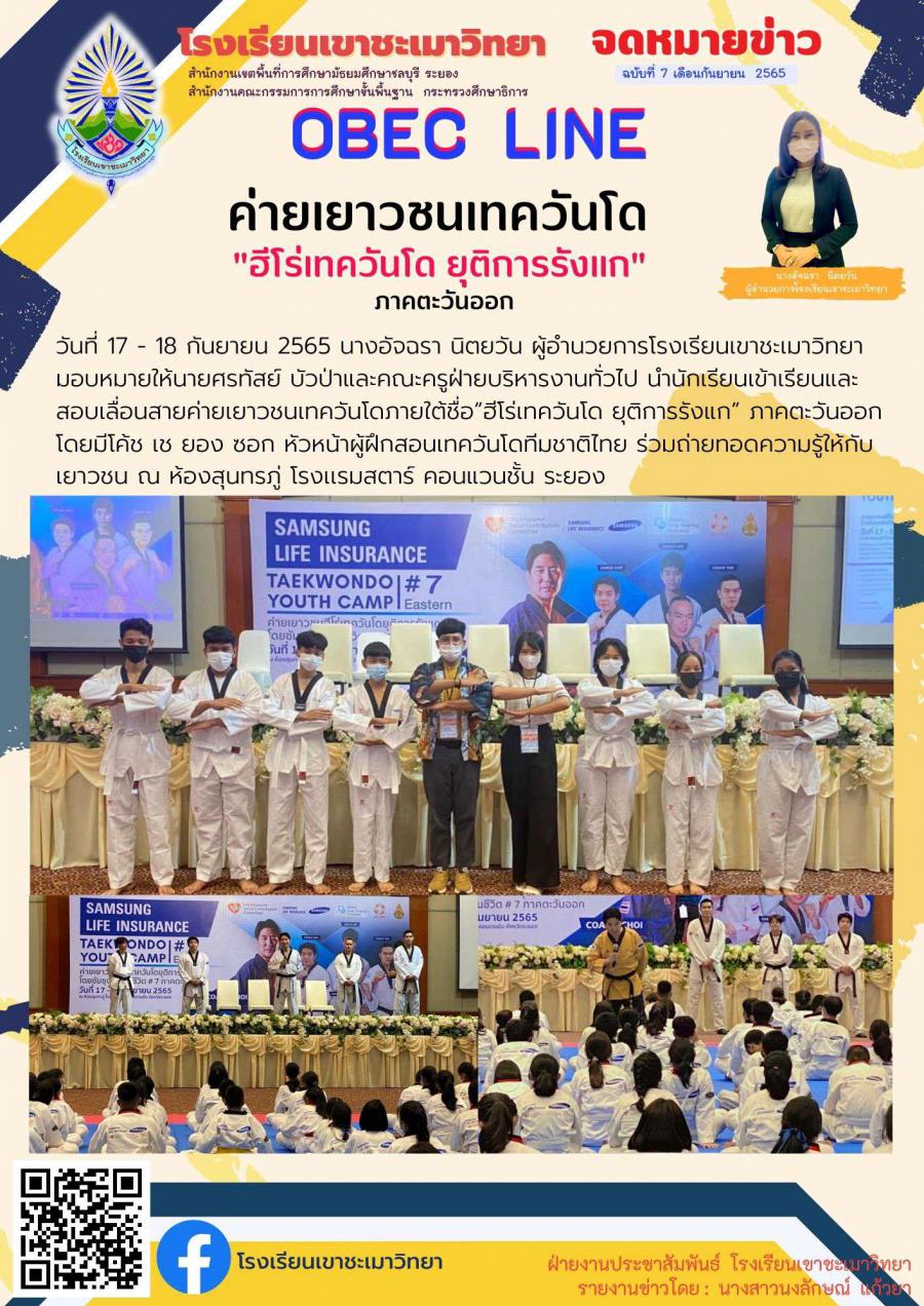 วันที่ 17 - 18 กันยายน 2565 นางอัจฉรา นิตยวัน ผู้อำนวยการโรงเรียนเขาชะเมาวิทยา มอบหมายให้นายศรทัสย์ บัวป่าและคณะครูฝ่ายบริหารงานทั่วไป นำนักเรียนเข้าเรียนและสอบเลื่อนสายค่ายเยาวชนเทควันโดภายใต้ชื่อ”ฮีโร่เทควันโด ยุติการรังแก” ภาคตะวันออก โดยมีโค้ช เช ยอง ซอก หัวหน้าผู้ฝึกสอนเทควันโดทีมชาติไทย ร่วมถ่ายทอดความรู้ให้กับเยาวชน ณ ห้องสุนทรภู่ โรงเเรมสตาร์ คอนแวนชั้น ระยอง