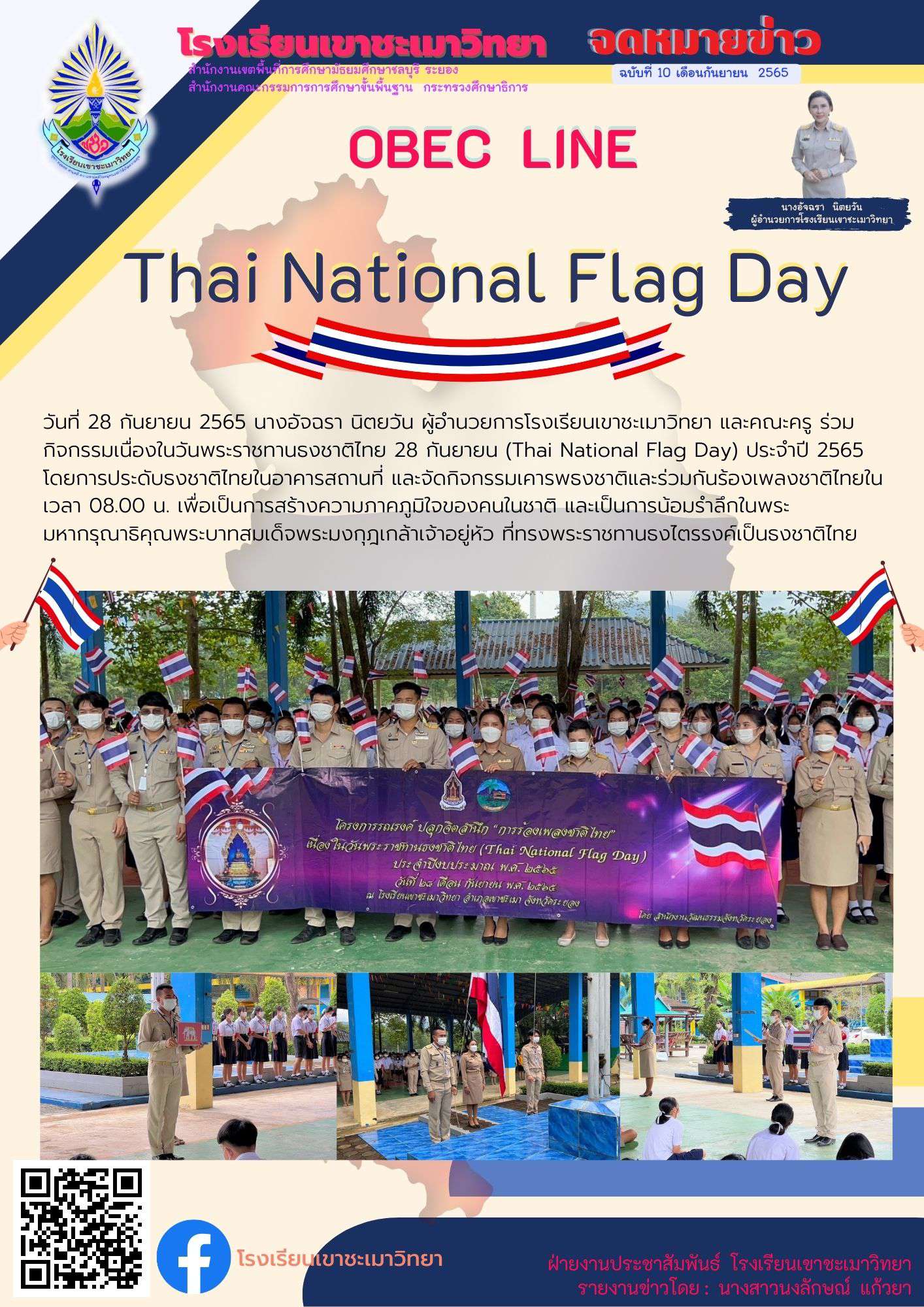 วันที่ 28 กันยายน 2565 นางอัจฉรา นิตยวัน ผู้อำนวยการโรงเรียนเขาชะเมาวิทยา และคณะครู ร่วมกิจกรรมเนื่องในวันพระราชทานธงชาติไทย 28 กันยายน (Thai National Flag Day) ประจำปี 2565 โดยการประดับธงชาติไทยในอาคารสถานที่ และจัดกิจกรรมเคารพธงชาติและร่วมกันร้องเพลงชาติไทยในเวลา 08.00 น. เพื่อเป็นการสร้างความภาคภูมิใจของคนในชาติ และเป็นการน้อมรำลึกในพระมหากรุณาธิคุณพระบาทสมเด็จพระมงกุฎเกล้าเจ้าอยู่หัว ที่ทรงพระราชทานธงไตรรงค์เป็นธงชาติไทย